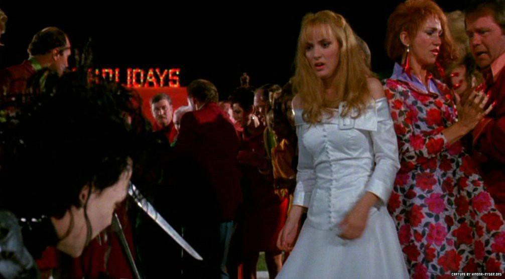 Edward Scissorhands (1990) , which is most likely Burton's most famous film, was actually inspired by his childhood and teenage years, as he felt he had little to no connection with his peers. He translates this beautifully, with a kind and sensitive portrayal of Edward as a loveable mute outcast. Edward Scissorhands is probably the most influenced by German Expressionism of all his films, with many scenes almost direct copies from The Cabinet of Dr Caligari (Robert Weine, 1920) a film hailed as the beginning of the German Expressionist movement and its style. Edward, played by Johnny Depp, wears an all black latex suit, with pale ghostly almost purple makeup sticks out like a sore thumb in the brightness of the suburbia he enters into. His colour scheme of black and white, amongst the brilliant colours in his surroundings only further emphasise him as an outsider. Winona Ryder plays Kim Boggs, the girl next door type. Her brilliant white dress and strawberry blonde locs whilst paired with Edward’s entirely black outfit symbolise their difference, and his otherworldly otherness. By the end of the film, her white dress is splotched with bright red blood, showing that whilst she never sees Edward again, he made an impression on her and her traditional suburban life.
