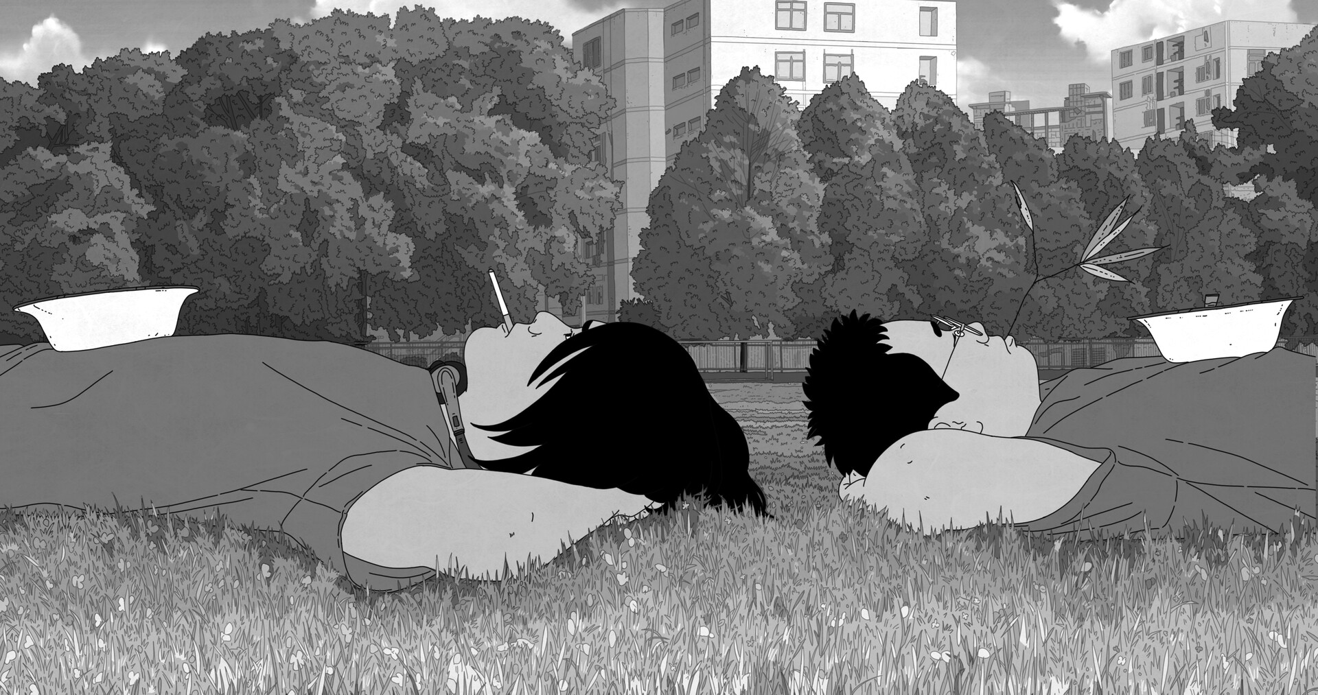 Its visual style is built from many contrasts. First, the character design uses clean block shading whilst the backgrounds of student locations use detail to depict piles of rubbish and dirty floors. At points the animation seems to use too little frames for certain movements (possibly to save time on the colossal feat of an animated film) but some sequences, such as the opening shot of a beetle falling over whilst climbing some rocks, depict kinds of movements that other animation studios would be scared to approach with a large degree of realism. The art itself also contrast with the artists by holding a different aestheticism and at points resembling reality more than the characters, automatically drawing in meta comments on art style that parallel the conversations of characters.