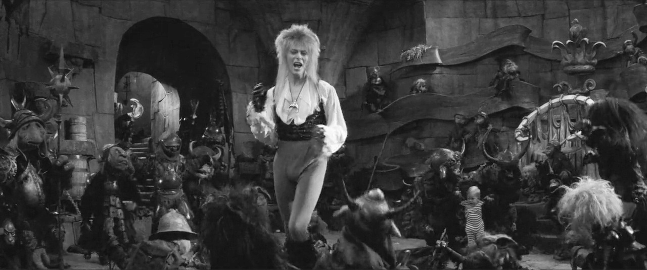Dreamy camp is much more of a niche group of Camp films; although they a very much like most of the films on this list, their visual style follows a hazy aesthetic. Throughout these films, there seems to be a dreamy filter permeating throughout. Instead of blinding colours, we are greeted by colours created with light. Artificial light appears to be visually absent through the moonlight, sunlight/daylight, or light fracturing from crystals, even though most of these films were probably filmed somewhere on a studio back lot. Think about The Wizard of Oz (Victor Fleming, 1939) ; although we have the bright yellow brick road and the sparkling emerald city, this dreamy quality seems to be perfused throughout. The same goes for Labyrinth (Jim Henson, 1986) ; even though we literally see David Bowie in a skin-tight body suit dancing around with a group of puppets, it doesn't come across as so conventionally Camp as the films before have. All I can say is these films have an airy quality to them. Even in Donkey Skin (Jacques Demy, 1970) , we have songs about incest, and horses dyed blue and red, a large throne in the shape of a cat, a woman vomiting frogs, a donkey that shits jewels and a fairy godmother turning up in a helicopter in what aesthetically looks like 15th-century France. However, in the end, I wouldn't think of these films straight away if you asked me for a Camp film. Again this style does follow musically inclined films; think about The Young Girls of Rochefort (Jacques Demy, 1967) , Xanadu (Robert Greenwald, 1980) and Grease (Randal Kleiser, 1978) . These films also seem to work with dreams; in Grease, we have Frenchy's Teen Angel dream with Frankie Avalon, and in Donkey Skin, we have Le Prince Charmant's dream about La Princess as he sings about the life that they'll live. However, none of the films are restricted to a particular genre, not all are fantasy or fairytale films, and not all are bound by a specific time. The only explanation I can really have for this style is the development of technology and certain film types the filmmakers were using. Although this is camp, it's subtle.