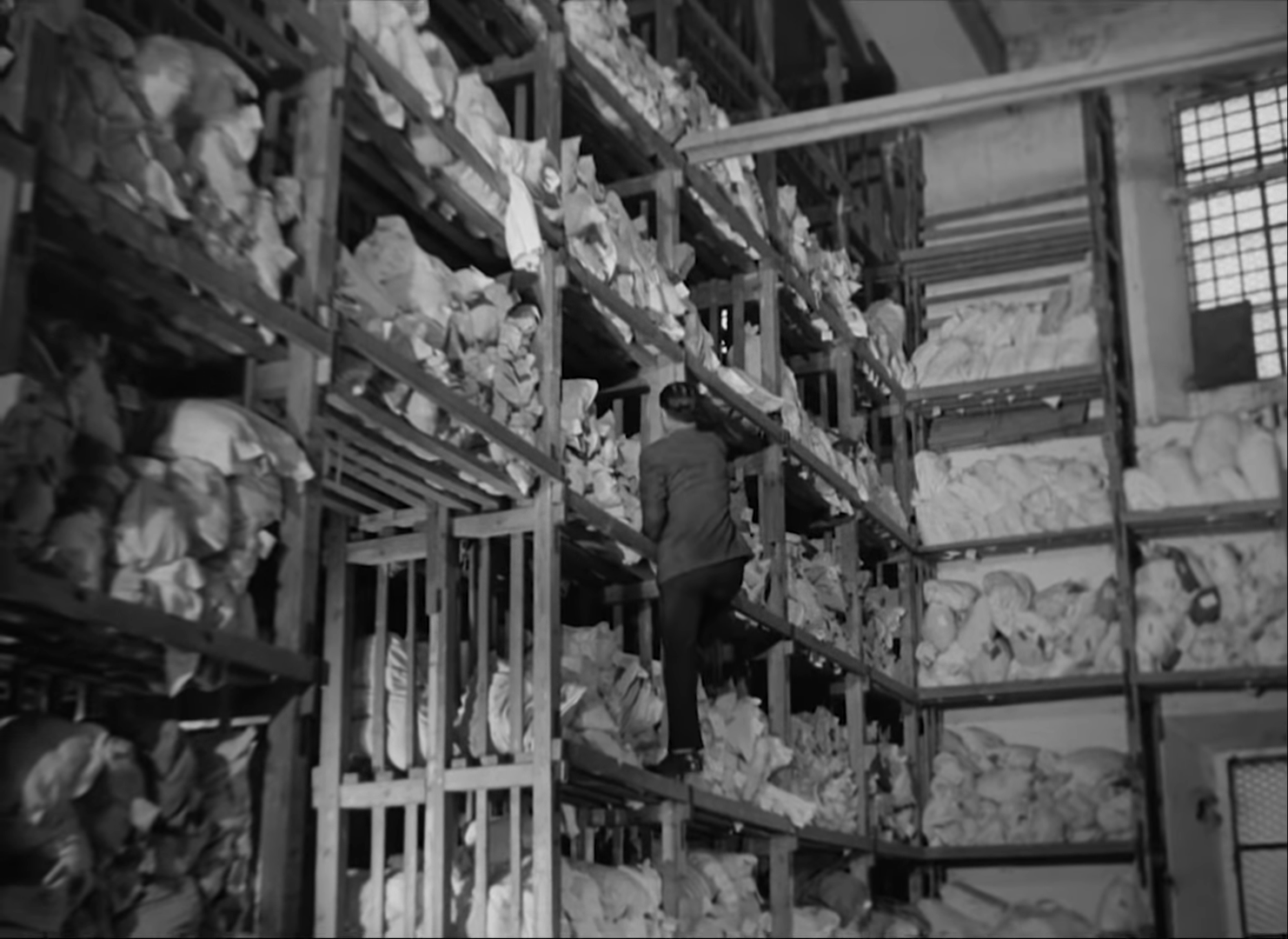 However despite this narrative simplicity, Bicycle Thieves also displays a large sense of scale through shots of visual magnitude. One instance of this is early in the film where Antonio and his wife, Maria, are forced to pawn their bedsheets to afford a bicycle. After the price is haggled and the bedsheets are handed over, we see a point of view shot from Antonio’s perspective of the clerk walking towards tall shelves filled with similar bundles of bedsheets. The camera follows the clerk as he then uses the shelves as a ladder to climb up to even more rows of packed bedsheets above - finally placing the family’s bundle into the masses. This shot implies the existance of many other stories like our protagonist Antonios throughout Rome, the magnitude of narratives that only one of which we are privy to. Repition of this visual magnitude occurs multiple times in this scene, including another similar shot of Antionio’s bike being selected from a row of hundreds or the long line of other families visible from the small window of the pawn shot - but it is also repeated throughout the film.