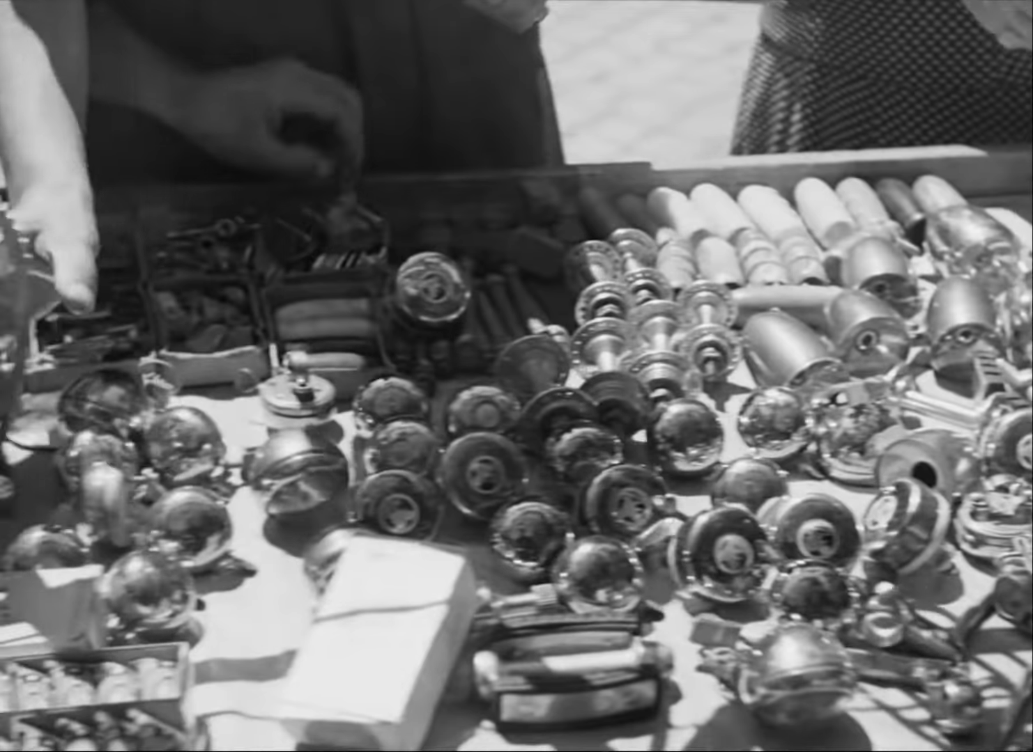 Rows of bells in the market scene of Bicycle Thieves, 1945.